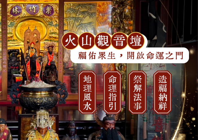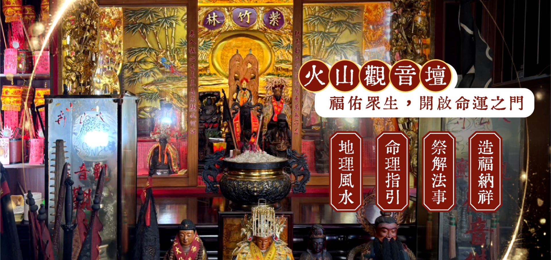 在天地運轉之間,萬物有序,命運有道。火山觀音壇,承天接地,秉持慈悲心 願,為您提供命理指引、風水造局、祭解法事等靈修服務,助您趨吉避凶、福慧雙增。